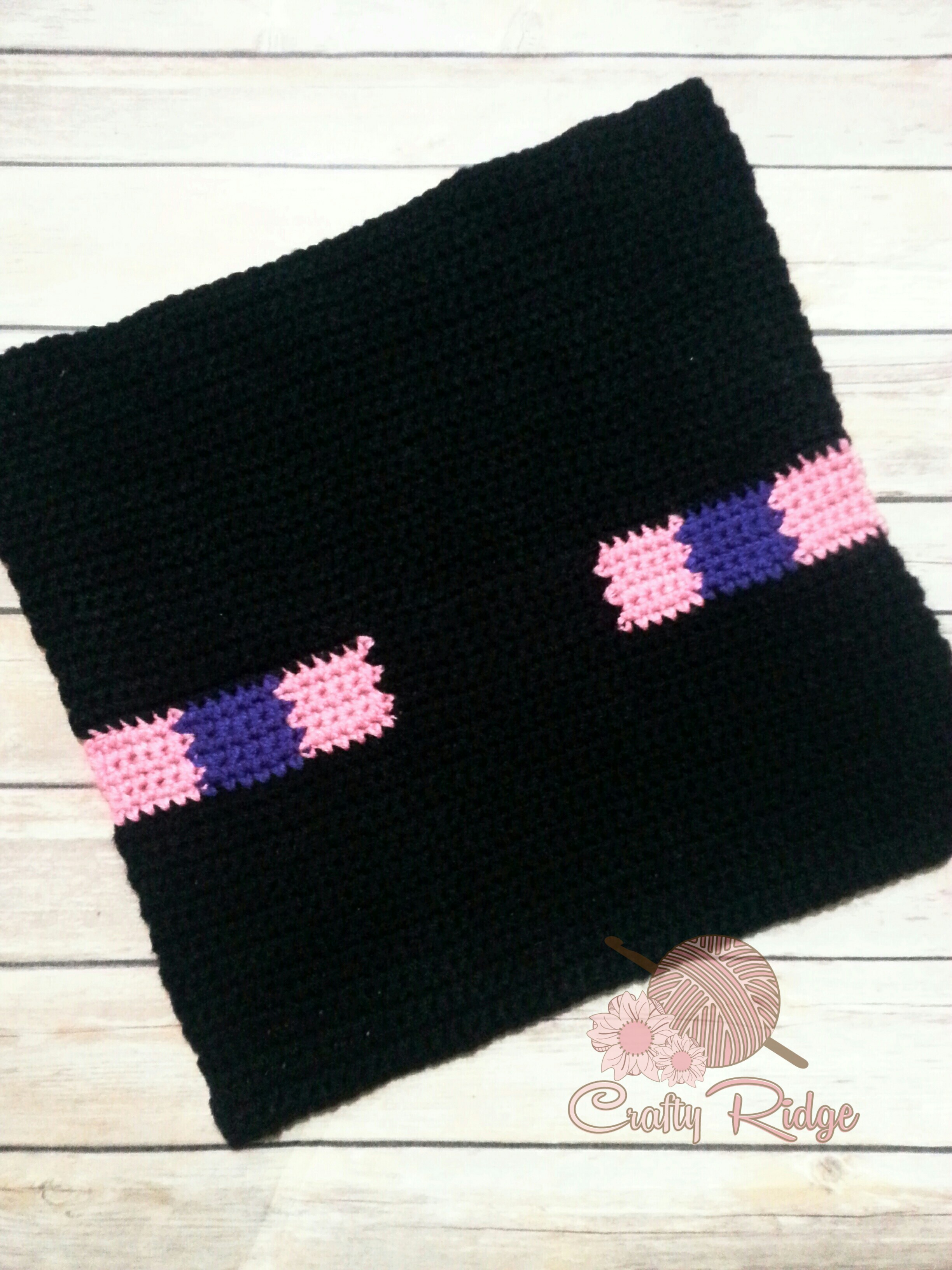 My Enderman was made with Red Heart Super Saver yarn in Perfect Pink, Amethyst and Black and an I hook. Again this square can be created in many different ways, whether it’s knit or crochet you just need to be able to read the graph and change colors.