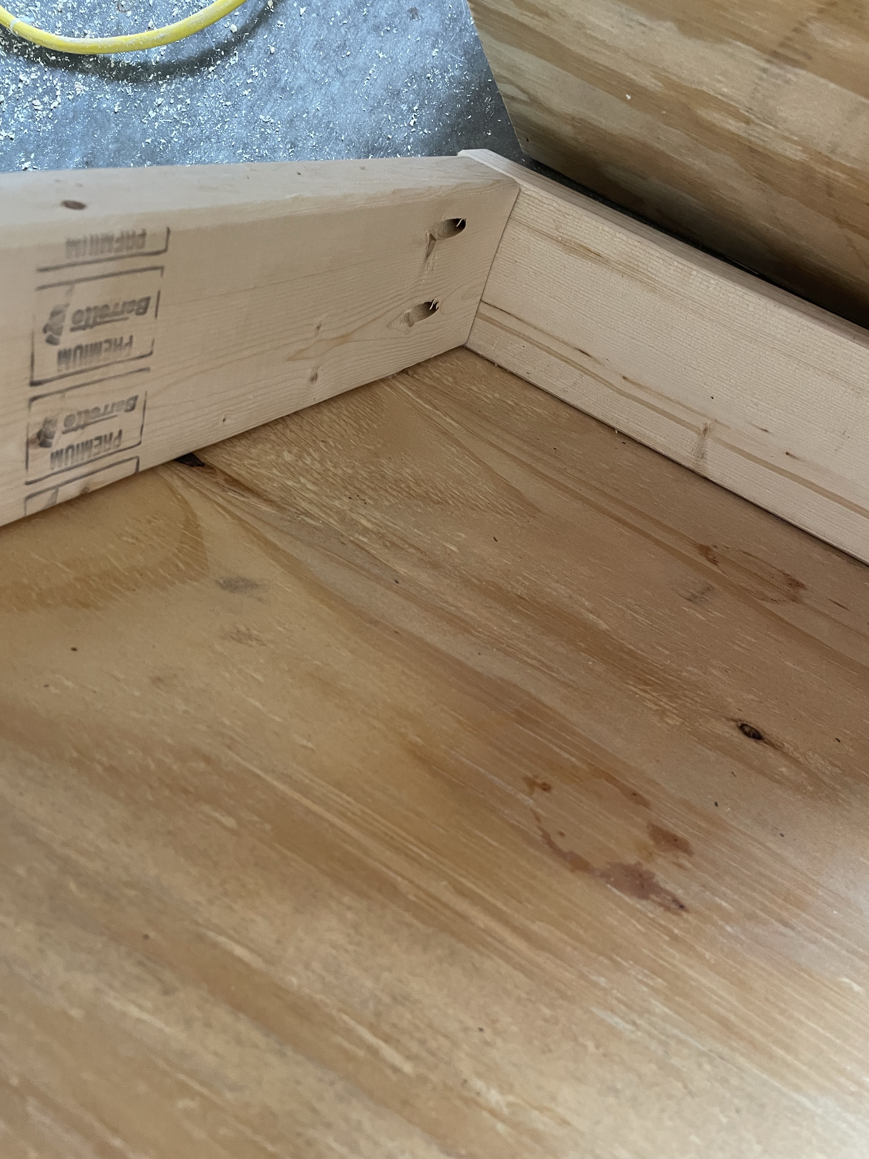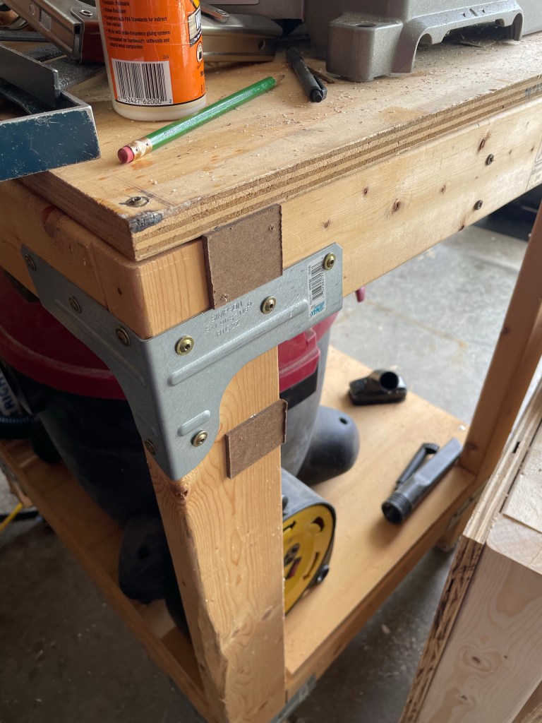 My original table had these brackets so the Folding Shelf Brackets I bought didn’t sit as level as I liked. So I tried shimming them and that didn’t work very well either. I ended up scraping that idea and removing the top and the brackets and then using pocket holes to reassemble the top.