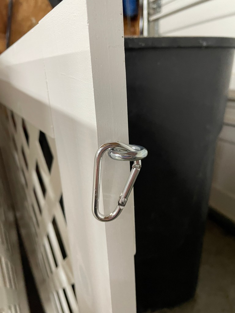 I then added some lag eye screws at the same measurements as the hinges on the two outer edges. I also added them to the frame of the door so I can use caribiners or locking s hooks to hold it securely to the frame and easily remove it as needed.