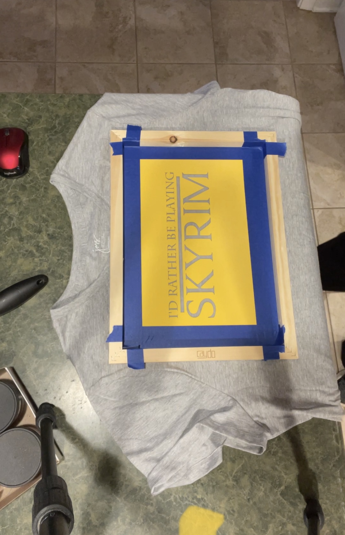 Apply the vinyl to the bottom of the frame. This is why we mirror the image. Having the vinyl on the bottom between the screen and the shirt makes for nice clean lines.
