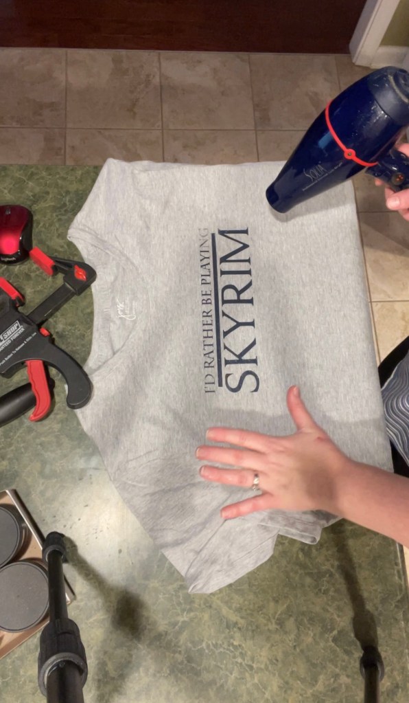 While pressing the frame down use the squeegee to drag the ink across the screen. You want to use a good amount of pressure and go over it a couple times to make sure your ink is filling out all of your design. You can scrape the extra ink back into the jar it came in and reuse it later. Then when you are ready lift the screen like its on a hinge, making sure to lift it off completely. Before setting the ink with the heat press it needs to be dry. I use my blow dryer but you can also leave it out on a flat surface to dry for a few days