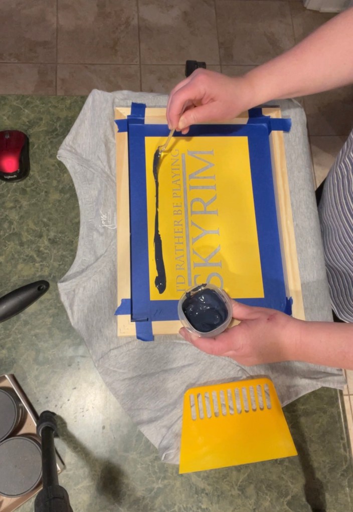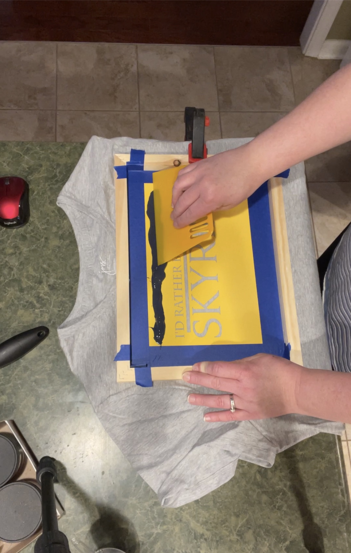 Now it is time to set the screen wear you want it and add the ink. To add the ink I use a plastic spoon and make sure there is plenty of ink across the top of the frame. You want the frame to be pushed down nice and snug so you don’t get any bleed through. I use a clamp on one side and my hand on the other.