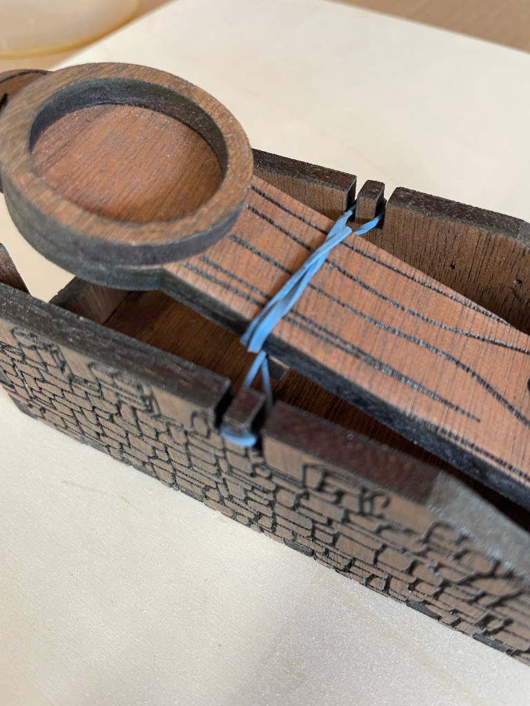 Step 6: Final Assembly With the base and arm prepared, it’s time to complete the assembly. Carefully slip the end of the arm into the hole in the hole in the front of the base, then slip the ends of the rubber band on to the tabs on each side, ensuring all components are securely fastened. Double-check the alignment and tension of the rubber bands for optimal performance. Test out the tension to see how it affects your launch.